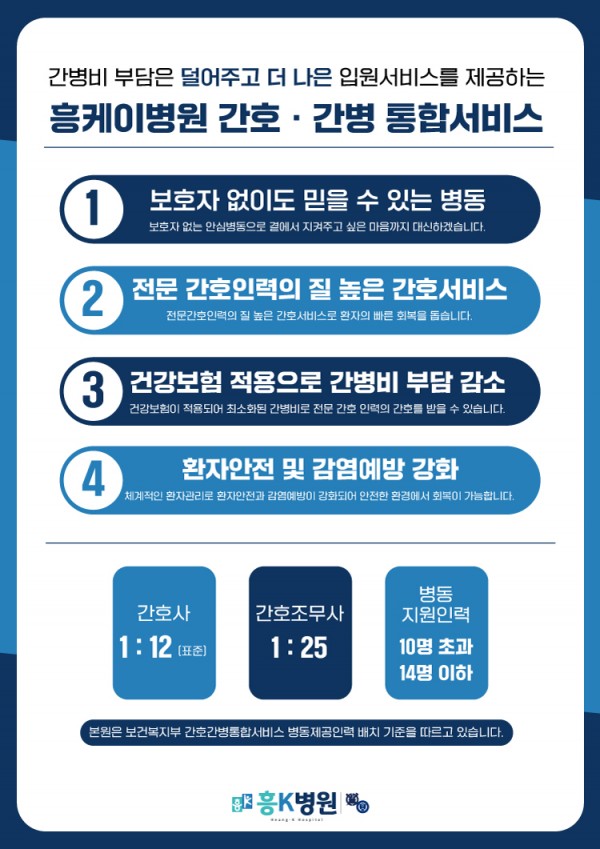 [공지사항] [흥케이] 흥K병원 간호·간병 통합서비스 제공인력 배치기준 작성일 : 2024.08.27 흥k병원 댓글 : 0 조회 : 3,349 안녕하세요, 흥K병원입니다.저희 흥K병원은 환자분들의 안정적인 회복과 보다 나은 편의를 위해 간호·간병 통합서비스를 운영하고 있으며, 이에 따른 통합병동의 인력 배치 기준을 안내드립니다.감사합니다.