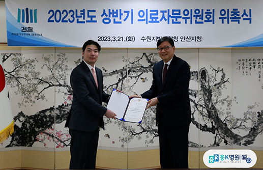 [이벤트] [흥케이] 김종근 대표원장, 수원지방검찰청 의료자문위원회 위원 위촉 작성일 : 2023.11.29 흥k병원 댓글 : 0 조회 : 743 안녕하세요. 흥케이병원입니다.수원지방검찰청은 지난 3월 21일, 안산지청 대회의실에서 2023년 상반기 의료자문위원 위촉식을 개최했습니다.김종근 대표원장과 함께 새롭게 구성된 안산지청 의료자문위원단은 관할지역의 권익보호의 앞장서면서 검찰청의 의료행위와 보건의료정책에 관한 사항을 자문하는 중요한 역할을 담당하게 됩니다.김종근 대표원장님은 흥케이병원을 통해 지역사회 건강 증진에 공헌하고 있습니다.이번 의료자문위원 위촉을 통해 더 많은 부분에서의 활약상을 기대합니다.